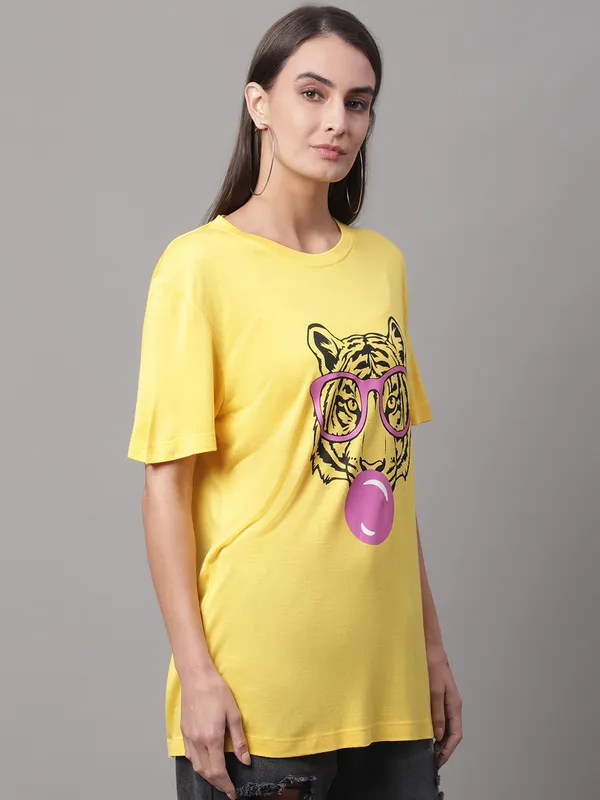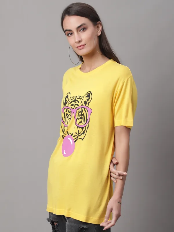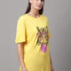 Stay comfortable and fashionable in our Door74 women’s t-shirt, made for effortless everyday style. Crafted from soft, breathable cotton, this yellow regular fit T-shirt features a classic round neckline and a comfortable silhouette for all-day ease. The fun tiger graphic print adds a playful, trendy vibe, making it perfect for casual outings, travel days, or relaxed weekends. Pair this Door74 women’s t-shirt with jeans, shorts, or joggers for a bright and stylish look.