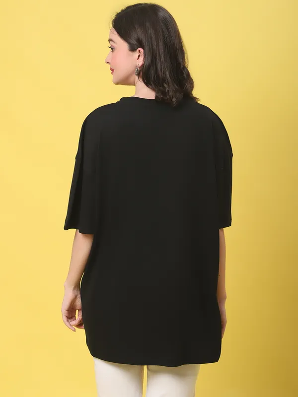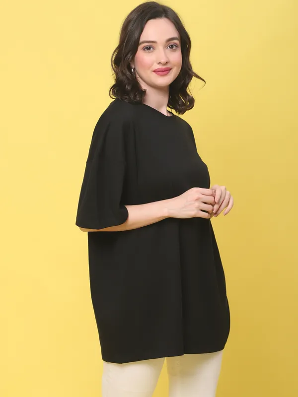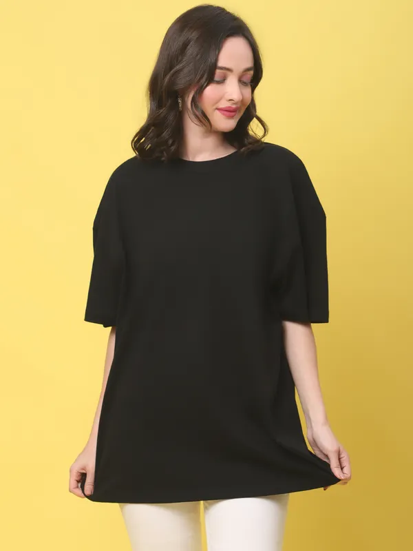 Black Cotton Solid Oversized Round Neck T-Shirt For Women