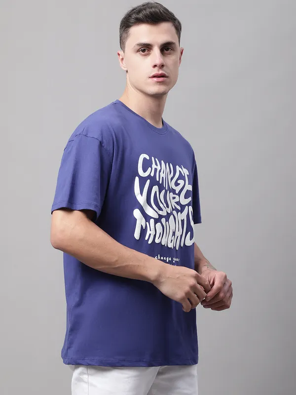 Navy Blue Cotton Printed Oversized T-Shirt For Men