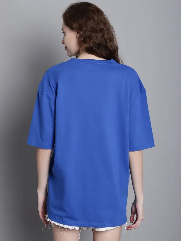 Royal Blue Cotton Printed Oversized Round Neck T-Shirt For Women