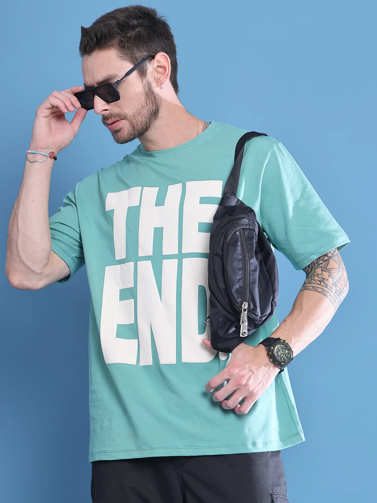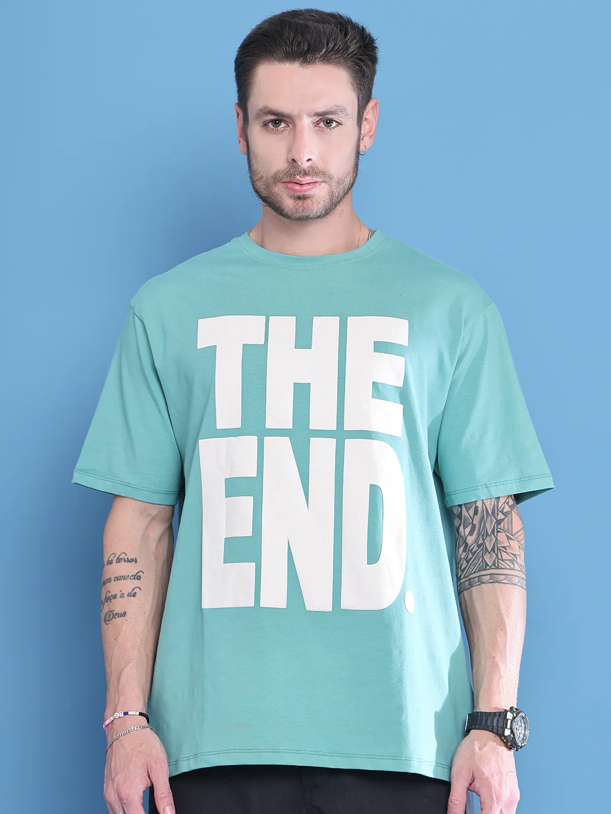 Stay comfortable and stylish in this Door74 men’s oversized T-shirt in a trendy Teal shade, featuring a bold “THE END” front print for a cool streetwear vibe. Made from soft, breathable cotton, it keeps you relaxed all day long. The oversized fit gives a laid-back trendy look with maximum comfort perfect for casual outings, travel, and everyday wear. Pair it with jeans, cargos, or shorts for an effortless stylish look.
