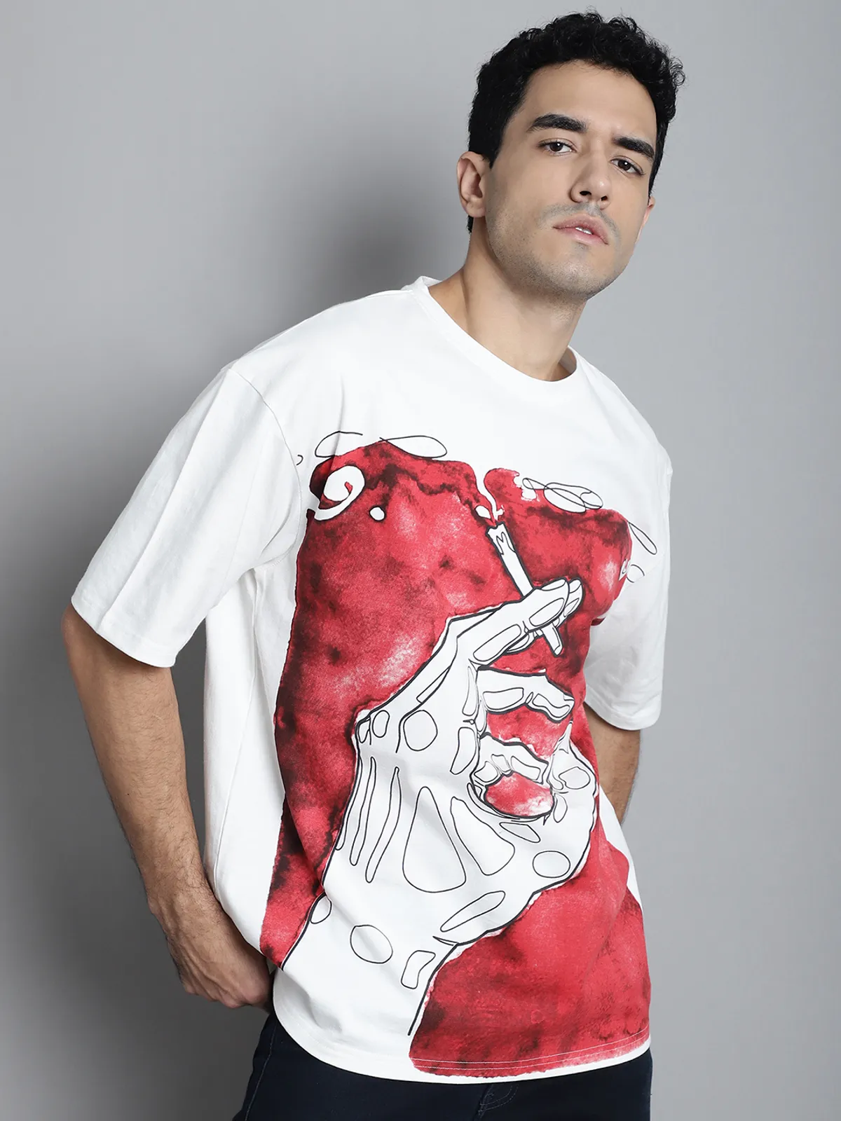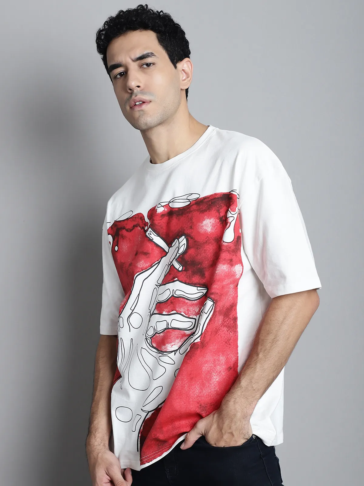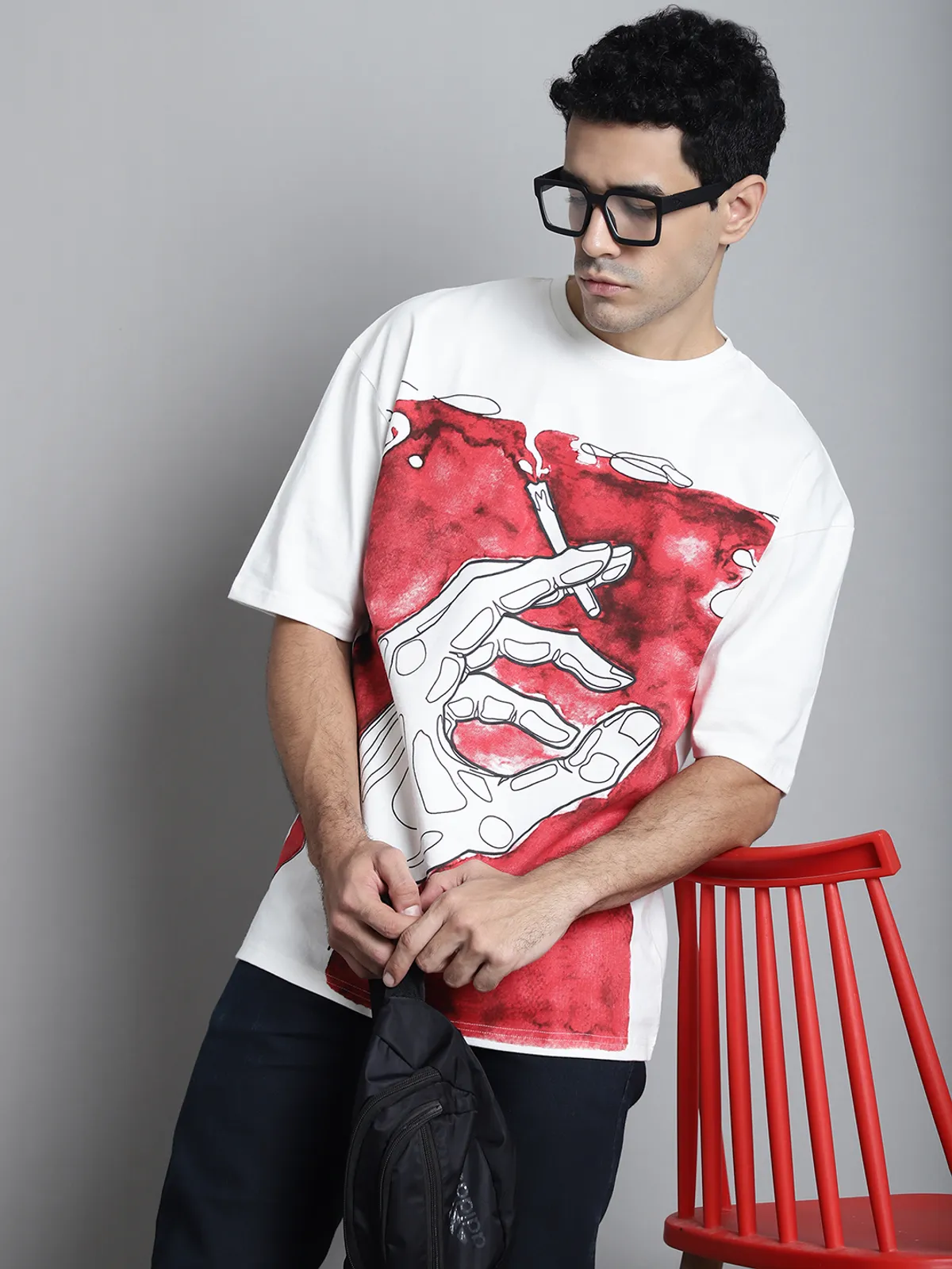Stay cool and stylish in our Door74 men’s White oversized t-shirt, featuring a bold red abstract front print with an artistic hand graphic for a standout streetwear vibe. Made from soft, breathable cotton fabric, this relaxed oversized fit ensures all-day comfort and effortless styling. The back side includes a unique “Statutory Warning: Cigarette Smoking is Injurious to Health” print detail, adding an edgy statement touch. Perfect for casual outings, travel, or everyday wear pair it with jeans, shorts, or joggers for a modern look.
