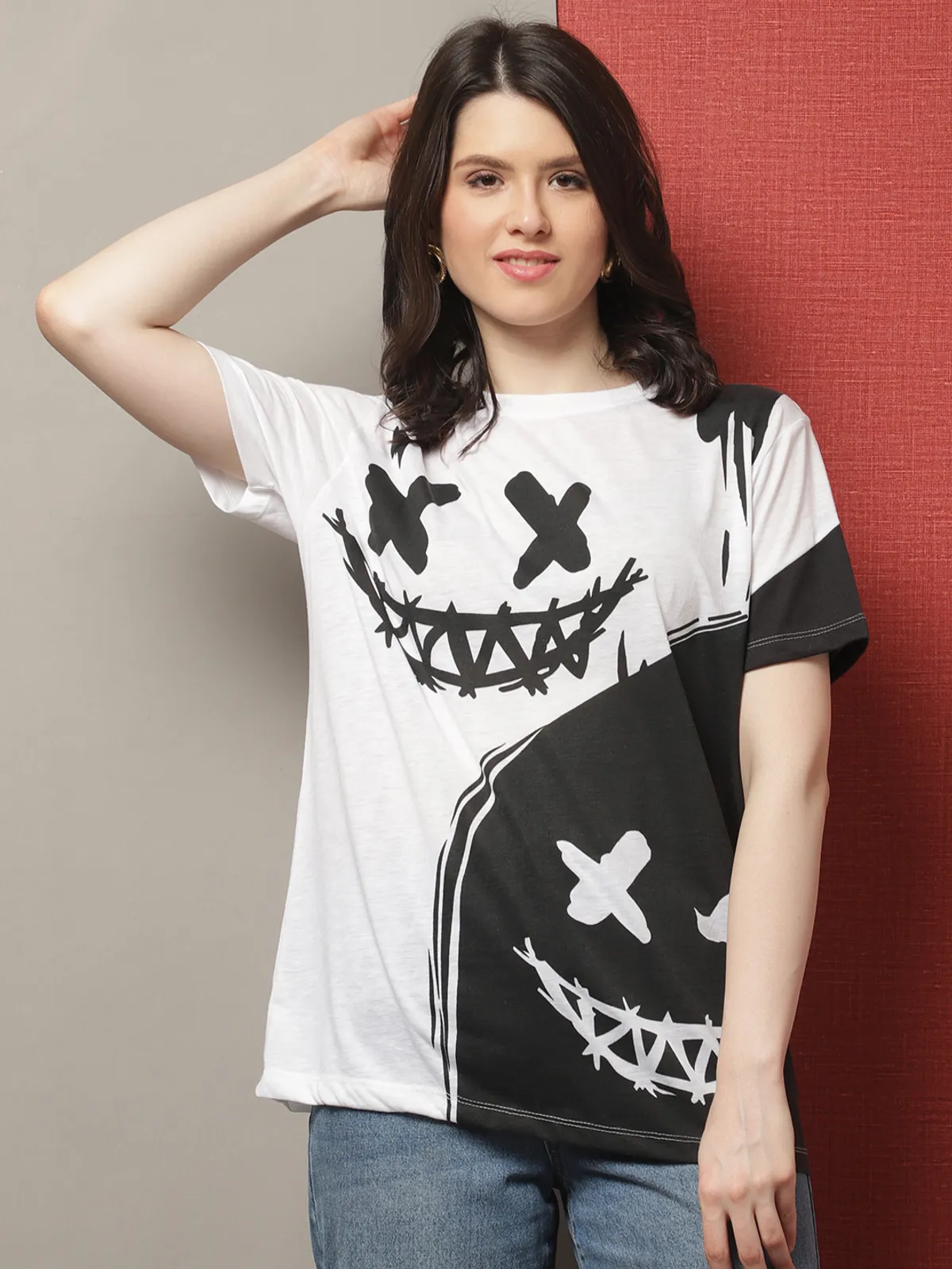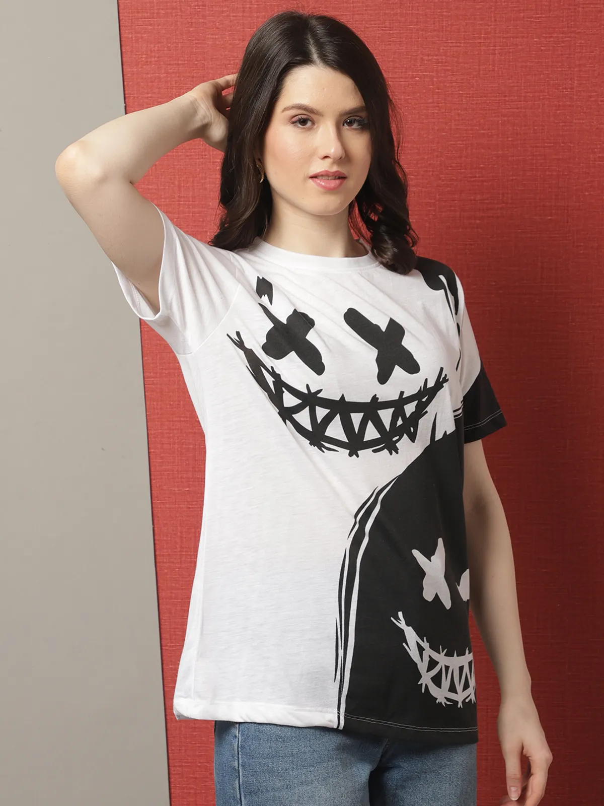 Stay cool and stylish in our Door74 women’s White regular fit round neck t-shirt, featuring a bold black graphic print for a trendy streetwear look. Made from soft, breathable cotton fabric, this comfortable regular fit is perfect for all-day wear and easy styling. The eye-catching front design adds a fun, edgy vibe that stands out effortlessly. Ideal for casual outings, travel, or everyday wear — pair it with jeans, shorts, or joggers for a fresh modern look.