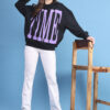 This black and purple sweatshirt has a bold look, but it is still easy to wear. The large typography print stands out right away, so you do not need to do much with the rest of the outfit. Just put it on with jeans or joggers, and it works. If you want a black hooded sweatshirt for women that feels a little different from the usual basics, this one does that well. This black cotton hoodie for women fits nicely into casual everyday wear.