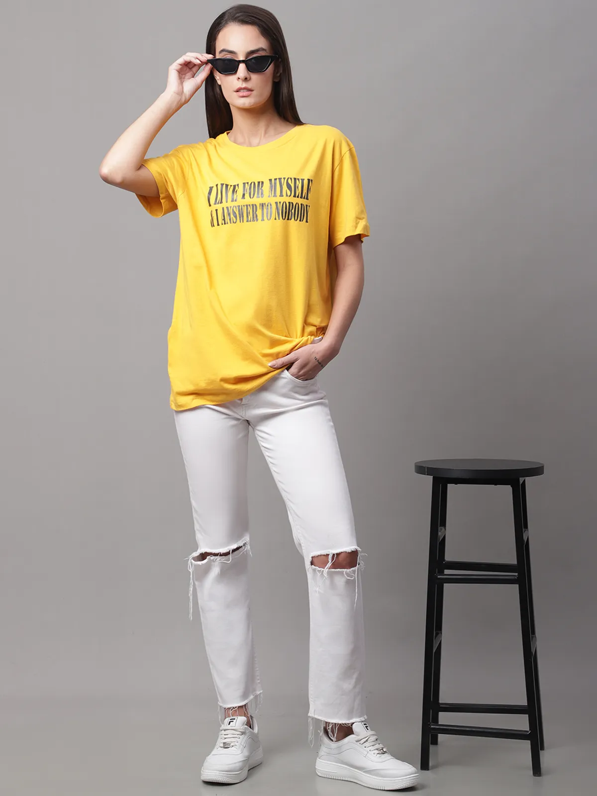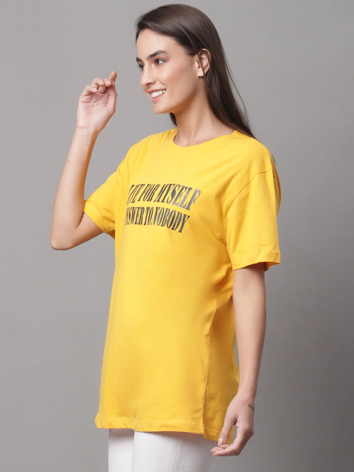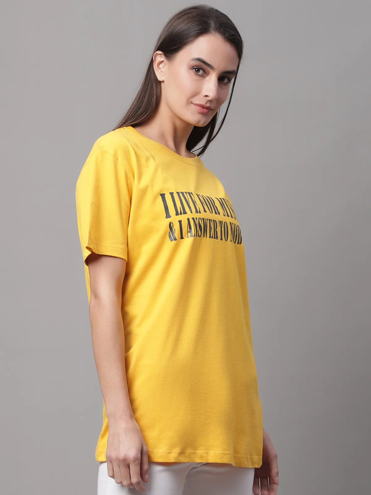 Stay cool and confident in our Door74 women’s Yellow regular fit t-shirt, featuring the bold slogan “I LIVE FOR MYSELF & I ANSWER TO NOBODY” for a strong statement look. Crafted from soft, breathable cotton fabric, this comfy regular fit makes it perfect for everyday wear. Style it with jeans, shorts, or joggers for an effortless casual vibe with attitude.