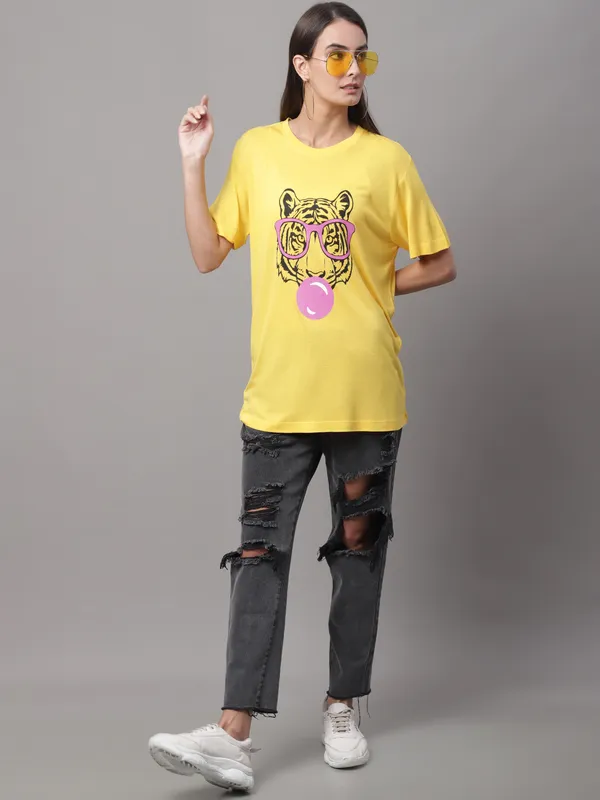 Yellow Cotton Printed Regular Fit Round Neck T-Shirt For Women